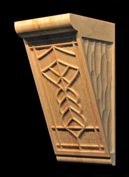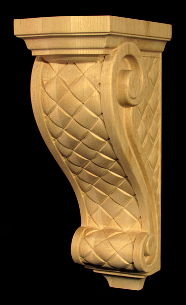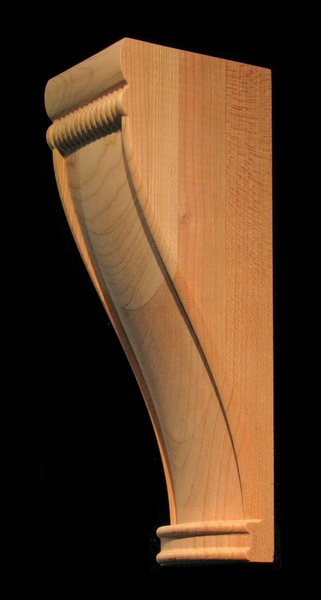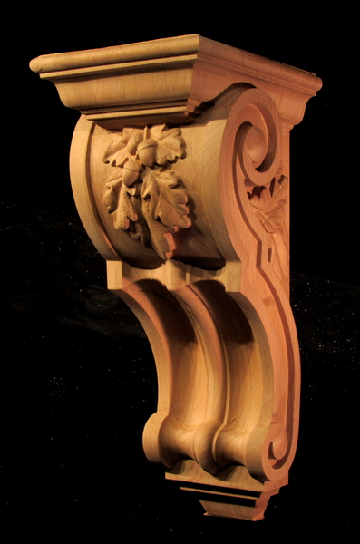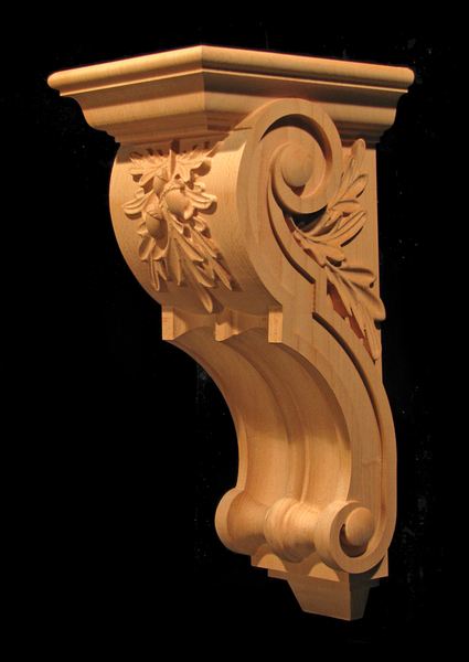 Corbels are one of the classical forms typically carved with three faces (but sometimes to reduce costs just the face)  and are placed in highly visible areas like fireplace mantels or Range hood supports to attract attention to the featured element above but often in the process due to their ornate nature they become the feature.   Heartwood offers a variety of corbel choices and will happily customize to suit your requirements.