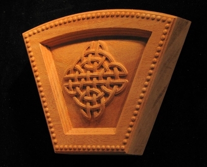 An arched keystone featuring a celtic knot center motif and perimeter beading. Sides are at a standard angle of 22.5°. Width refers to widest point. Shown in Mahogany. Alternative sizes by CUSTOM REQUEST.