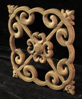 A medallion styled after an iron grate ornament. Shown in Walnut. Pierced.