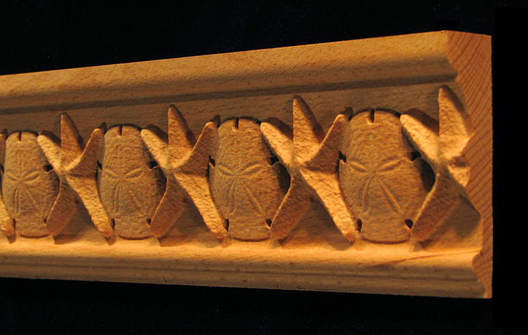 A wood carved moulding featuring a repeating pattern of starfish and sand dollars.