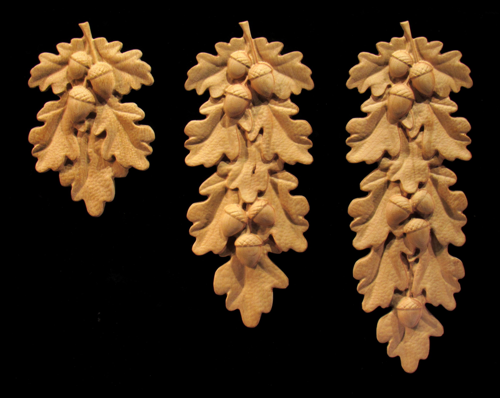 Onlay of oak leaves and acorns composed in 3 different lengths, short, medium and long in three different widths to suit a range of size applications. Custom sizes also available by inquiry.
