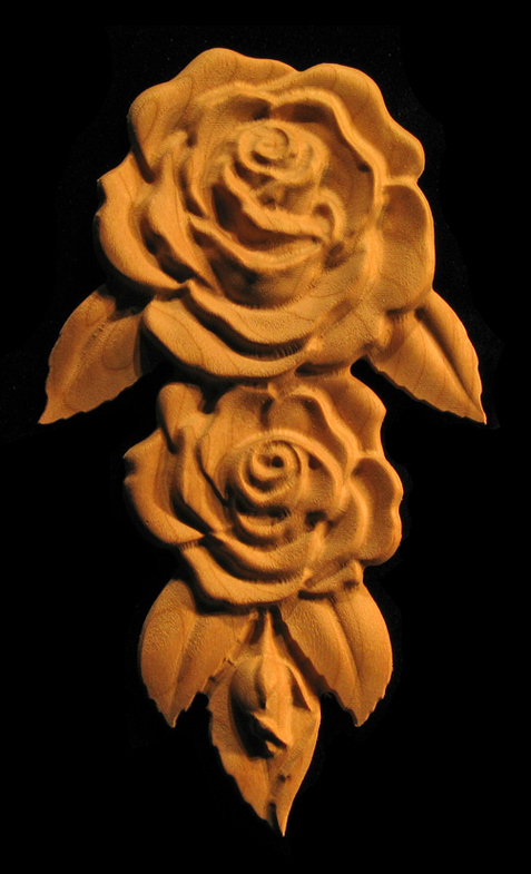 A drop onlay of a rose flower used in locations looking for a drop style of ornament in a fireplace mantle, bookcase, or other vertical setting. Alternative sizing available by custom request.