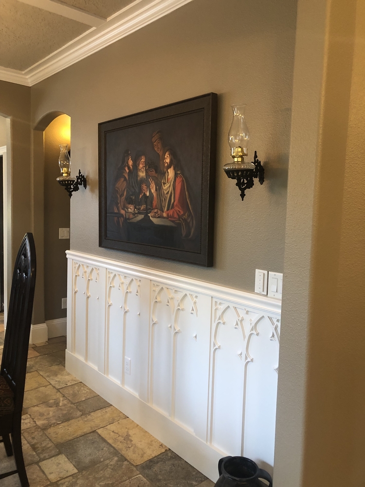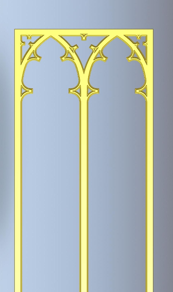 A gothic arch mullion panel (pierced) for door or wainscoat insert featuring simple arches that can be repeated as singles, doublets or triplets (doublet shown) and other repeats to get size required. These panels are available by CUSTOM REQUEST based on width and overall length. Shown in MDF for paint grade applications but also available in our standard hardwoods. Panels are carved in 3/8" thickness with additional border option for the bottom. If panels are required to have a solid background then thickness will increase. Please enquire.