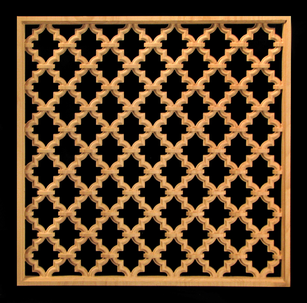 The Marrakesh pattern is the featured ornament in this grill-work composition for insert panels. It is available pierced or with background. The panel is available by CUSTOM QUOTE REQUEST only and please indicate your preference for size, borders, and wood type. The art can be increased in size or detail added for larger applications.